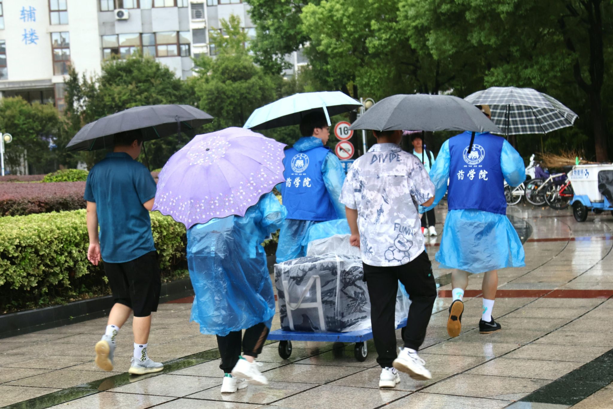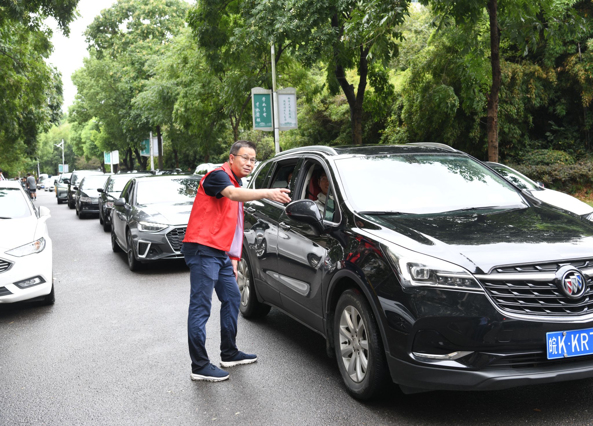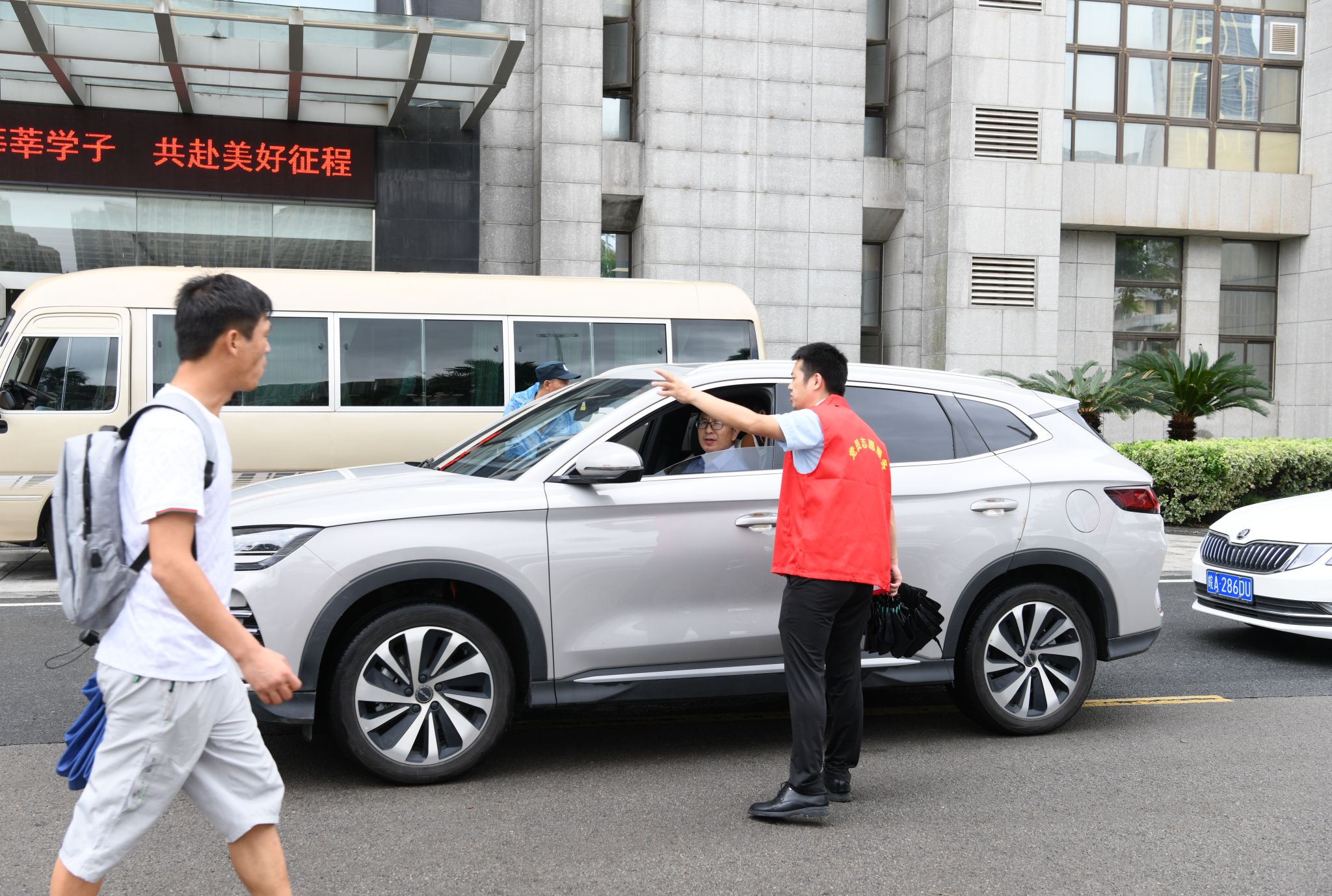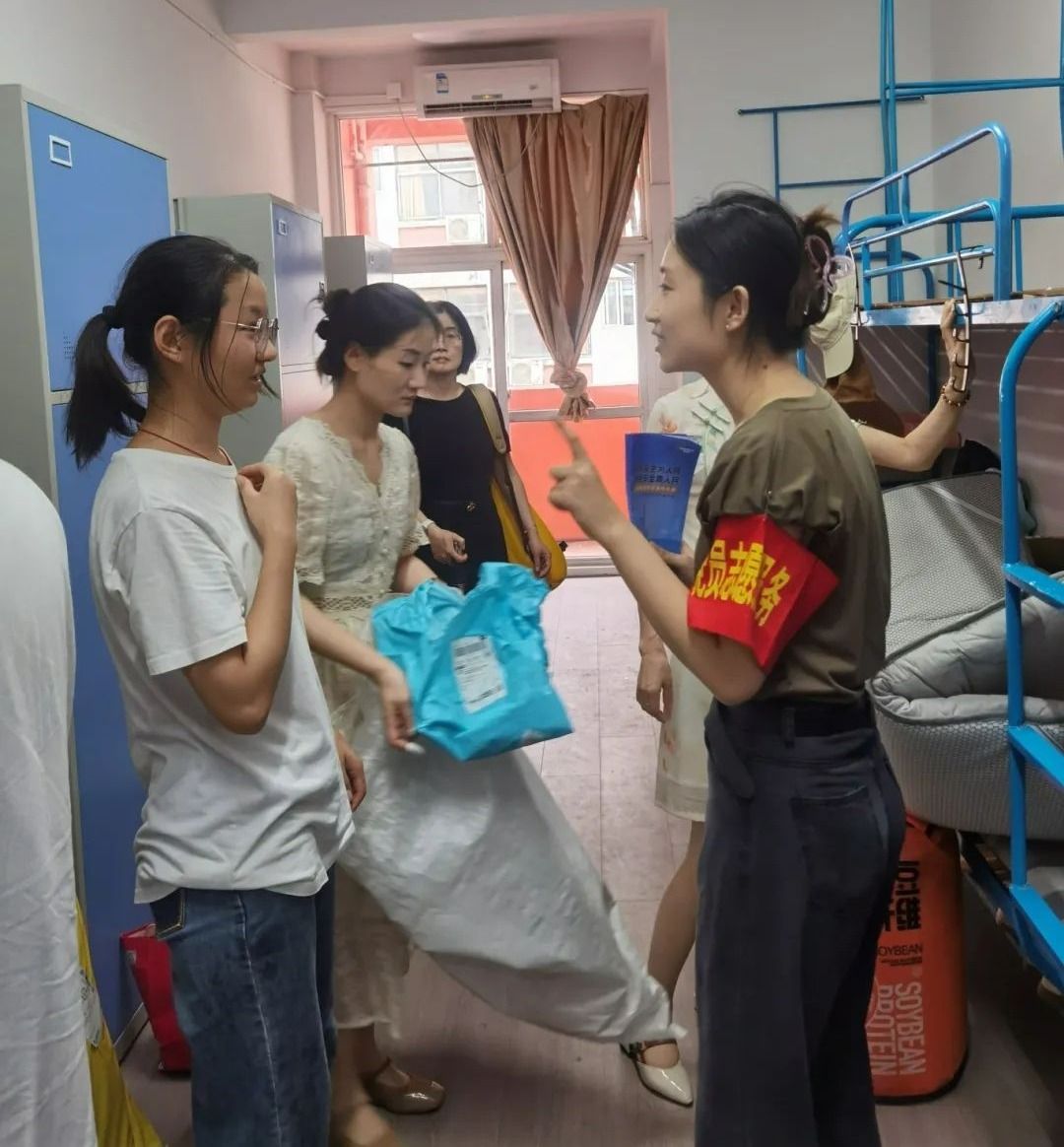 全心全意迎新生,全力以赴办实事。在迎新现场,还有一支由师生党员组成的志愿服务队。他们统一佩戴党徽,亮出党员身份,用心用情用力投身迎新工作中,开展交通疏导、防诈防推销宣传、新生引导咨询、行李搬运等工作任务。尤其迎新首日,由于校门口市政道路维修、校内停车空间有限,为避免自驾车辆拥堵,保证交通通畅,由教师党员组成的党员先锋队早早到达指定位置,配合保卫处耐心引导新生报到自驾车辆有序进校、安全停放、下卸行李、定向驶离。虽然穿着雨衣,但雨水和汗水却早已浸湿了他们的衣背。据统计,迎新期间,全校共设立党员服务站16个,成立党员服务队16个,有近600名师生党员参与迎新工作中,他们以实际行动擦亮了党员底色,让党旗在迎新一线高高飘扬,让党徽在迎新一线闪闪发光。