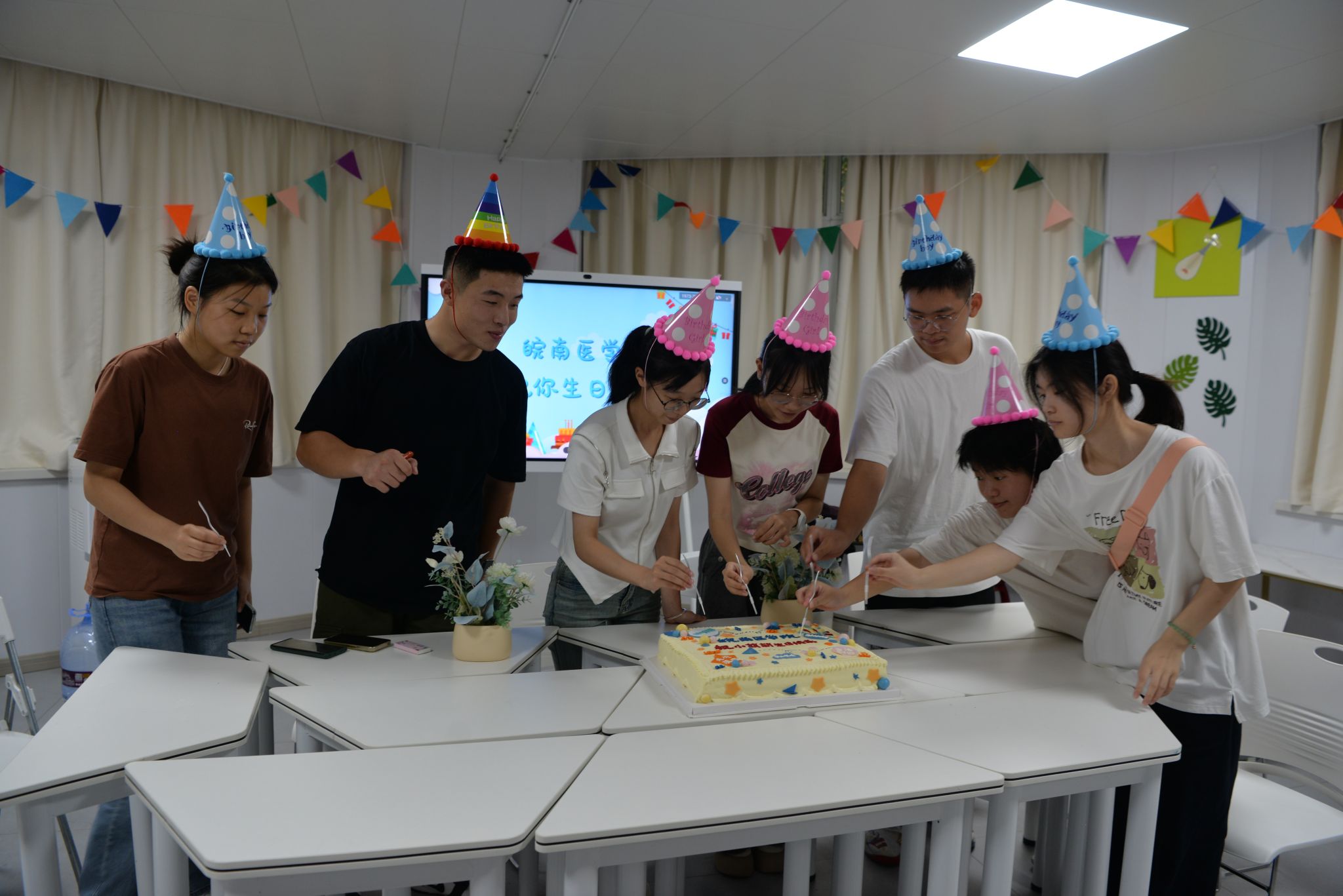 学校组织开展“你来学习,我买单”“你来读书,我买单”“你来运动,我买单”抽奖活动,新生通过扫描二维码参与活动,即可有机会领取入学文具大礼包、图书购物卡、运动器材等;在“一站式”学生社区,学校为恰逢报到日生日的7名新同学准备了一场特殊意义的集体生日会,戴生日帽、唱生日歌、分生日蛋糕……同学们沉浸在欢乐、温馨的氛围中,感受到了学校和老师、同学们的温暖和关怀;制作“我爱皖医”拍照打卡点、楼梯文化墙、带有皖医元素的文创产品等,将爱校荣校教育融入迎新环节,拉满初见氛围感,增强新生对学校的认同感和归属感。
